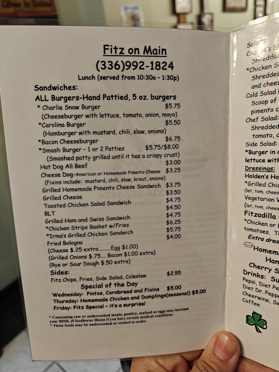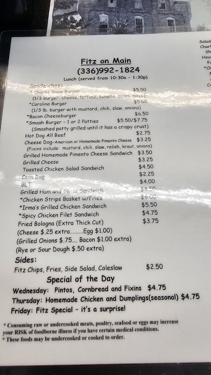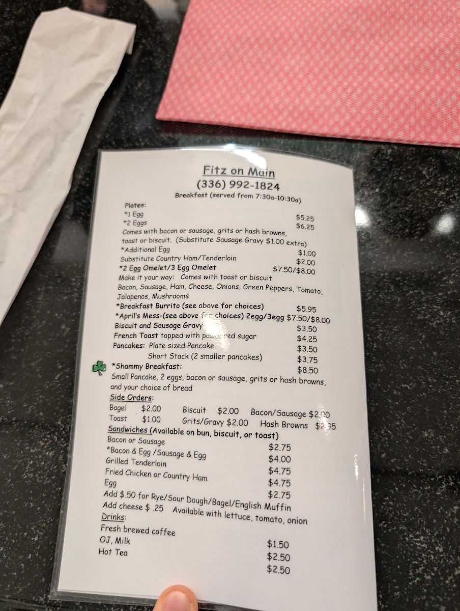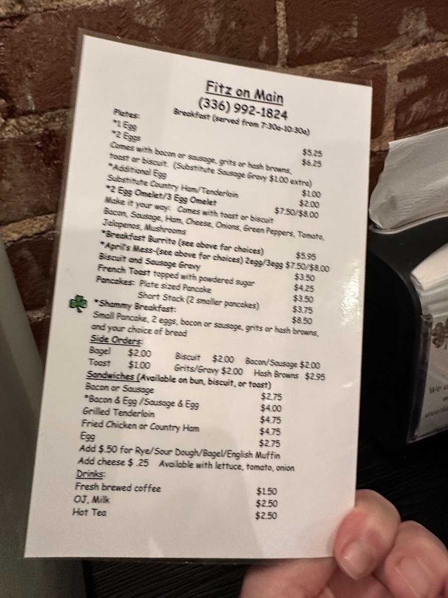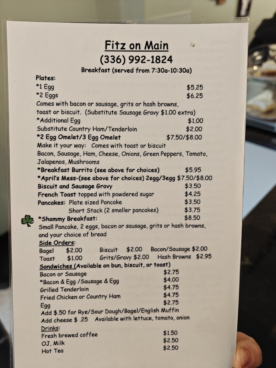 At Fitz On Main Menu, located in the heart of Kernersville, NC, you'll find a delightful blend of Southern comfort and contemporary dishes that cater to all tastes. From hearty breakfasts to satisfying dinners, every dish is crafted with fresh, locally sourced ingredients to bring out the best in every bite. Whether you’re in the mood for a savory sandwich, a classic salad, or one of their signature entrees, there's something for everyone on the menu. Each meal is thoughtfully prepared, ensuring that no matter what you choose, you’ll experience the perfect balance of flavors. Whether you’re stopping by for a quick bite or settling in for a relaxed meal, Fitz On Main is the perfect spot to enjoy a delicious meal with friends and family.